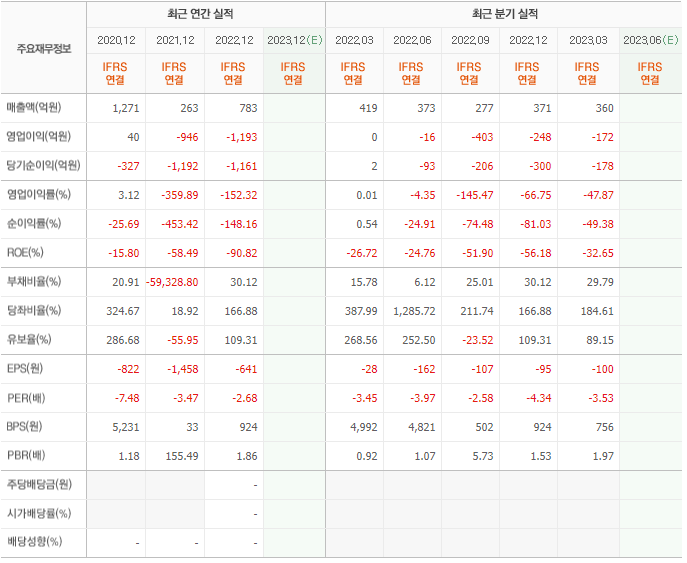 2022년 매출은 783억, 영업이익은 -1193억, 당기순이익은 -1161억입니다. 그리고 영업이익률은 -152.32%입니다.