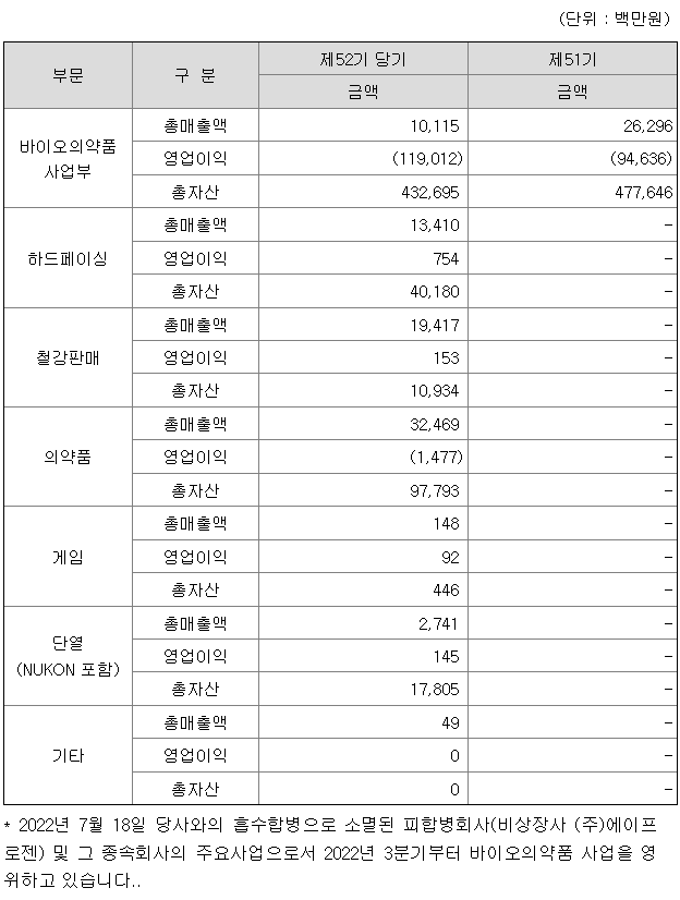 2022년 7월 18일 당사와의 흡수합병으로 소멸된 피합병회사의 주요사업은 인간화항체(Humanized Antibody) 공학기술, 재조합단백질(Recombinant Protein) 설계기술, 우수 세포주(Cell-line) 제작기술 및 배양공정(Cell Culture) 최적화 기술을 기반으로 자가면역질환 치료제, 항암제 등 단백질 치료제(therapeutic proteins) 중심의 바이오의약품 개발, 생산으로 바이오의약품 사업부에 속합니다.