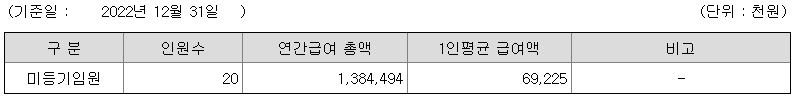 미등기임원의 평균연봉은 6900만원이고 직원수는 20명입니다.