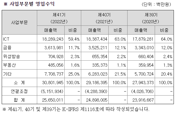 연결회사의 각 부분은 독립된 서비스 및 상품을 제공하는 법률적 실체에 의해 구분되어 있으며, 각 연결회사의 사업의 내용에 대해 (1) 유무선 통신/컨버전스 사업을 제공하는 ICT, (2) 신용카드사업을 제공하는 금융사업, (3) 위성방송서비스사업, (4) 케이티의 자산을 활용한 부동산사업 (5) 콘텐츠, 정보기술, 글로벌사업 및 자회사가 영위하는 기타사업으로 구분하고 있습니다.