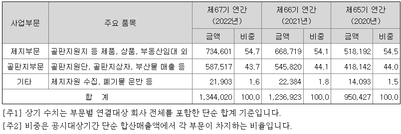 제지산업은 펄프 및 고지를 주 원재료로 하여 각종 종이제품을 생산하는 사업으로 거액의 투자비가 소요되는 자본집약적 대형 장치산업입니다. 자동화된 생산설비, 재고자산 보관과 운송을 위한 물류시설, 에너지설비, 폐수시설 등을 포함한 대규모 설비와 넓은 부지가 필요하며, 사업 초기 대규모 투자자본이 소요되는 장치산업 특성상 총자산에서 유형자산이 차지하는 비중이 비교적 큰 편입니다.