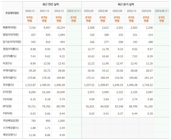 2022년 매출은 1조 234억, 영업이익은 1094억, 당기순이익은 944억입니다. 그리고 영업이익률은 10.70%입니다.