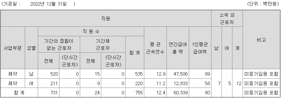 | 사업부문 | 성별 | 직원수 | 평균근속연수 | 평균연봉(백만) |