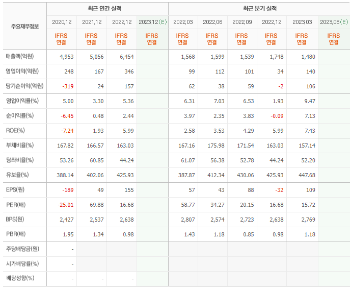 2022년 매출은 6454억, 영업이익은 346억, 당기순이익은 157억입니다. 그리고 영업이익률은 5.36%입니다.
