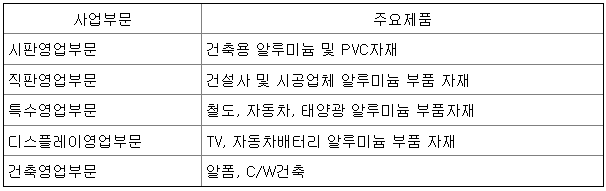 알루미늄 및 PVC 건축용 자재를 취급하는 부서로 서울, 대전, 영남, 호남 등에 영업소를 두어 고객과의 밀접한 유대관계를 형성하고 있으며, 전국에 100여개의 대리점을 해당 지역의 영업소에서 관리하고 있으며, 이 대리점을 통해 매출을 발생시키고 있습니다.
