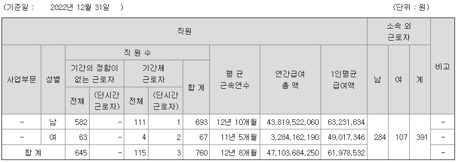 | 사업부문 | 성별 | 직원수 | 평균근속연수 | 평균연봉(백만) |