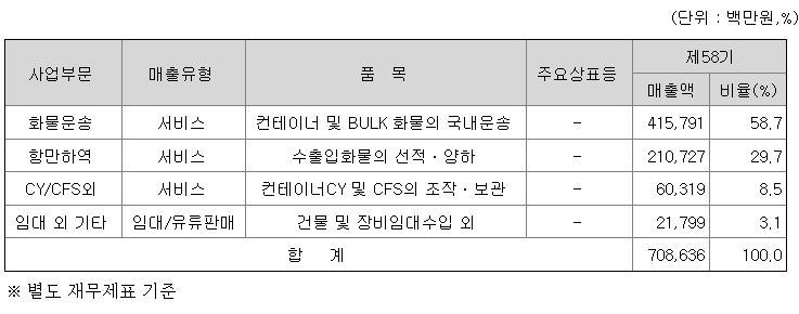 당사의 벌크부문은 국내에 12개 항만에서 벌크화물을 하역하고 있으며, HarborCrane 등 100대 이상의 하역장비를 보유하여 연간 4천 200만톤 이상의 벌크화물을 처리하고 있습니다. 당사는 국내 대형 화주물량을 안정적으로 확보하고 있으며 전국 주요 지역의 물류창고운영 및 초중량물운송 등 차별화 된 운송서비스와의 연계를 통해 생산성 향상 및 경쟁력 강화에 주력하고 있습니다.