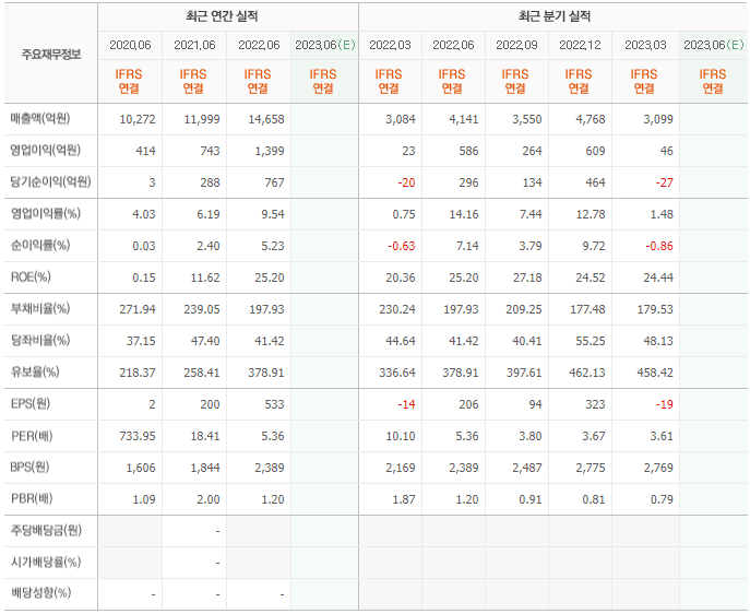 2022년 매출은 1조 4658억, 영업이익은 1399억, 당기순이익은 767억입니다. 그리고 영업이익률은 9.54%입니다.