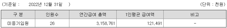 미등기임원의 평균연봉은 1억 2100만원이고 직원수는 26명입니다.