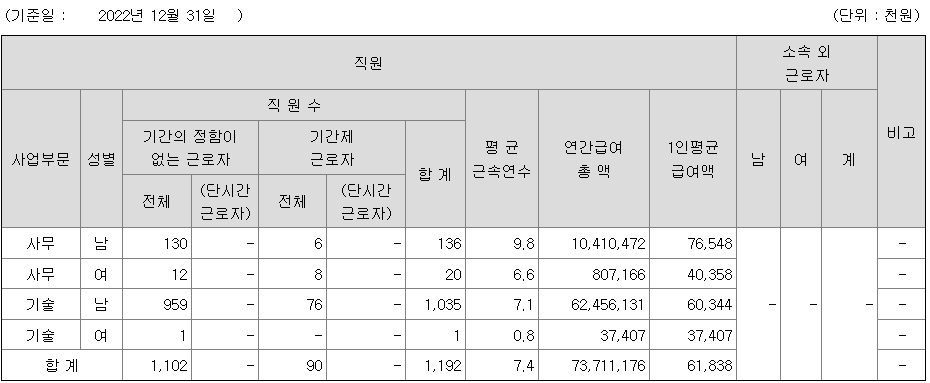 전체 평균연봉은 6100만원이고 직원수는 1192명입니다.