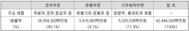 또한 석유화학 및 윤활기유 부문에서도 높은 사업 안정성을 가지고 있습니다. 윤활기유 부문은 고급윤활기유를 중심으로 하루 4만 4천배럴의 생산능력을 보유하고 있으며, 석유화학부문은 지속적인 투자와 공정 효율화를 통하여 연간 약 330만톤의 대규모 방향족 제품(파라자일렌, 벤젠 등) 생산능력 뿐 아니라 연간 약 71만톤의 올레핀계 제품(PP, PO 등) 생산능력도 보유하고 있습니다. 현재 당사는 수직 계열화된 생산 체계에 기반한 우수한 생산효율성과 사업안정성을 바탕으로, 석유화학을 중심으로 비정유부문의 사업기반을 강화하고 있습니다.