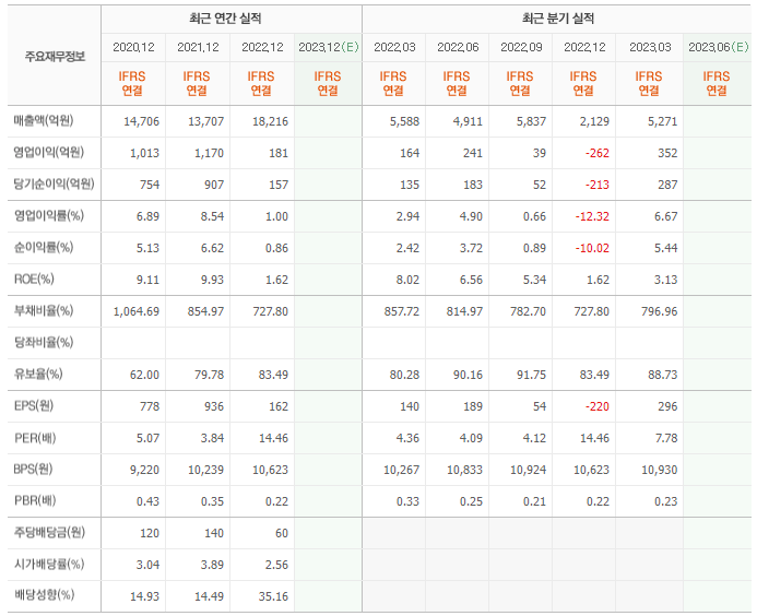 2022년 매출은 1조 8216억, 영업이익은 181억, 당기순이익은 157억입니다. 그리고 영업이익률은 1.00%입니다.