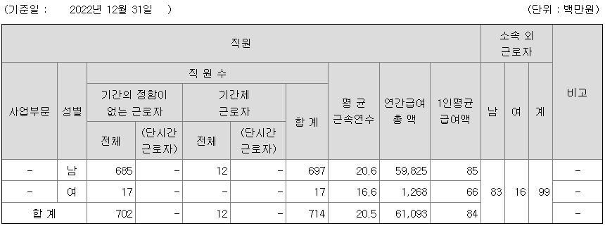 | 사업부문 | 성별 | 직원수 | 평균근속연수 | 평균연봉(백만) |