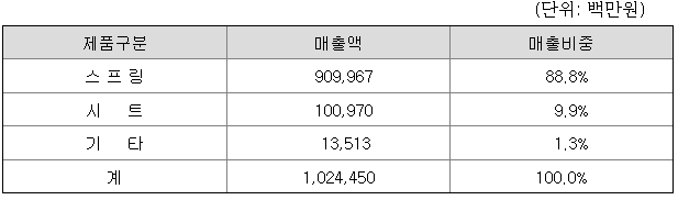 연결회사는 차량용 스프링과 시트제품 등을 생산ㆍ판매하고 있으며, 2022년 연간 각 제품별 매출액과 매출비중은 다음과 같습니다.