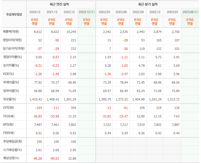 2022년 매출은 1조 245억, 영업이익은 221억, 당기순이익은 232억입니다. 그리고 영업이익률은 2.15%입니다.