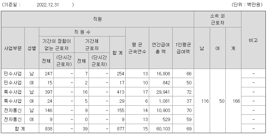 | 사업부문 | 성별 | 직원수 | 평균근속연수 | 평균연봉(백만) |