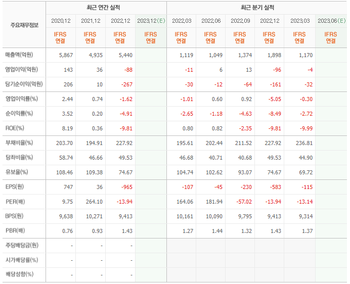 2022년 매출은 5440억, 영업이익은 -88억, 당기순이익은 -267억입니다. 그리고 영업이익률은 -1.62%입니다.