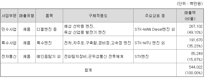 당사는 디젤엔진 전문생산업체로 출범하여 엔진, 전자통신, 부품/서비스 사업을 중심으로 하는 엔진, 중전기 종합 회사입니다. 사업을 민수사업, 특수사업, 전자통신사업의 3개 사업부문으로 구분하여 운영하고 있으며, 지배회사와 종속회사의 사업내용을 요약하면 아래와 같습니다.