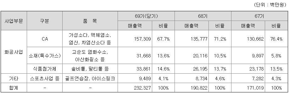 당사는 염화나트륨을 원료로 하여 알칼리와 염소를 생산하는 무기화학제품 제조업체로서 국내에서는 롯데정밀화학, 한화솔루션, LG화학, OCI 등이 당사와 동일제품을 생산 판매하고 있으며, 식품첨가제로 사용되는 솔비톨과 말티톨을 생산 판매하고 있습니다. 또한 사업다각화의 목적으로 2019년부터 음성공장을 신설하여 아산화질소(N2O)를 생산, 판매하고 있으며, 군산공장에 반도체용 특수가스인 고순도염소(2008년)와 염화수소(2021년)의 생산설비를 도입하여 시장을 개척하고 있습니다.