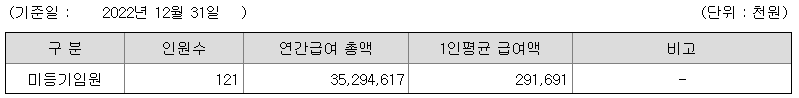 미등기임원의 평균연봉은 2억 9100만원이고 직원수는 121명입니다.