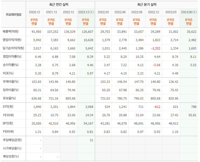 2022년 실적은 13조 6539억, 영업이익은 9662억입니다. 그리고 영업이익률은 7.08%입니다.