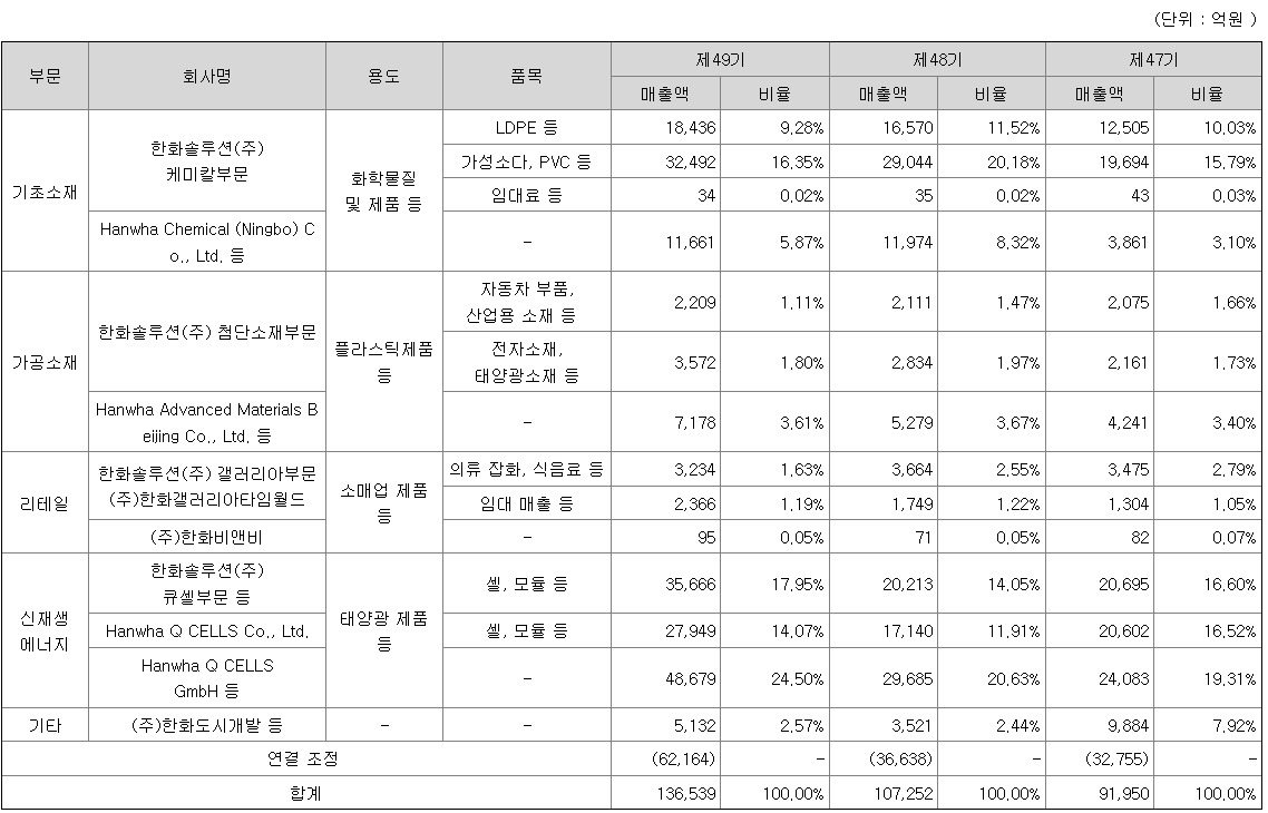 사업별로 보면, 원료부문에는 PE, PVC, CA, TDI 제품 등을 생산ㆍ판매하고 있으며셀과 모듈 등의 태양광 제품을 담당하는 신재생에너지부문, 자동차 부품, 산업용 소재, 전자소재, 태양광 소재 등을 담당하는 가공부문, 의류/잡화/화장품/주류 등의 상품 매출을 담당하는 리테일부문 마지막으로 부동산 사업을 담당하는 인사이트부문이있습니다.