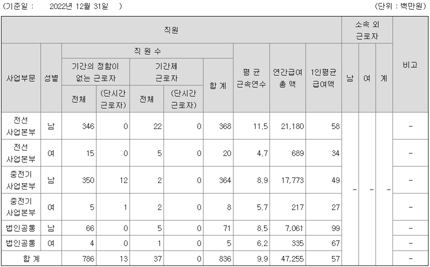 사업부문 | 성별 | 직원수 | 평균근속연수 | 평균연봉(백만) |