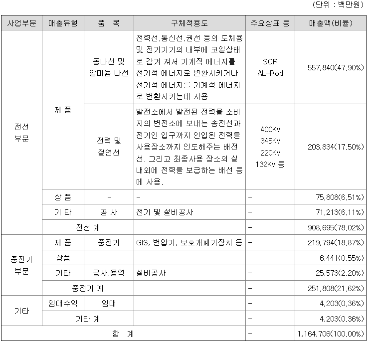 당사는 수익을 창출하는 재화와 용역의 성격, 제품, 제조공정의 특징, 사업부문 구분의 계속성 등을 고려하여, 당사의 사업구분을 전선, 중전기로 세분하였습니다. 전선사업부의 매출액은 9,086억이고, 중전기사업부의 매출액은 2,518입니다.