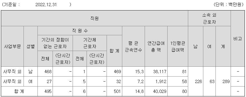남성의 평균연봉은 8100만원이고 직원수는 469명, 여성은 5800만원이고 직원수는 32명입니다. 전체 평균연봉은 8000만원이고 직원수는 501명입니다.