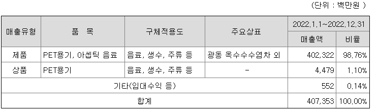 아셉틱 음료 및 PET용기는 주식회사 삼양패키징이 사업을 영위하고 있는 패키징 사업 분야로 PET용기는 위생성, 보존성, 안전성, 내약품성, 투명성, 경량성이 우수하여 음료, 주류, 식품 등의 포장용기로 널리 사용되고 있습니다.