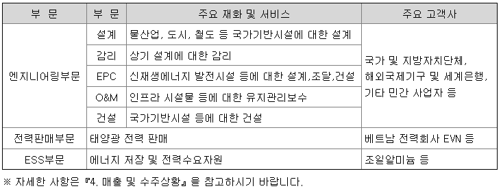 당사와 연결회사는 물산업, 도시, 철도, 플랜트, 수자원 등 SOC(사회간접자본) 전 분야에서 종합토목설계업, 종합감리전문업 등 전문적인 엔지니어링사업과 신재생에너지 발전시설등의 건설업, 시설물의 유지관리보수업, 태양광 전력 판매업 등을 수행하고 있습니다.