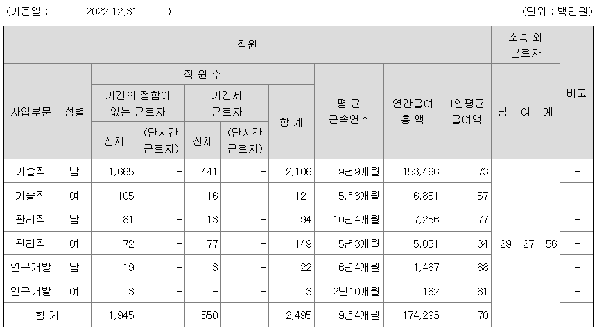 | 기술직 | 남 | 2,106 | 9년9개월 | 73 |
