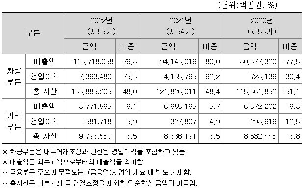 차량부문과 기타부문의 주요 재무정보는 아래와 같습니다.