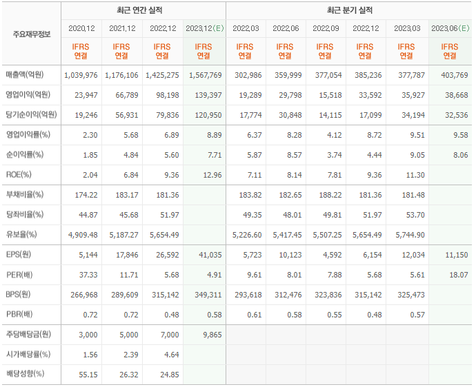 2022년 실적은 142조 5275억, 영업이익은 9조 8198억입니다. 그리고 영업이익률은 6.89%입니다.