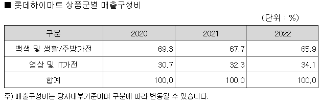 당사는 가전제품 도ㆍ소매업을 영위하며, 주요 품목은 '백색 및 생활/주방가전 품목'과 '영상 및 IT가전 품목'으로 구분됩니다.