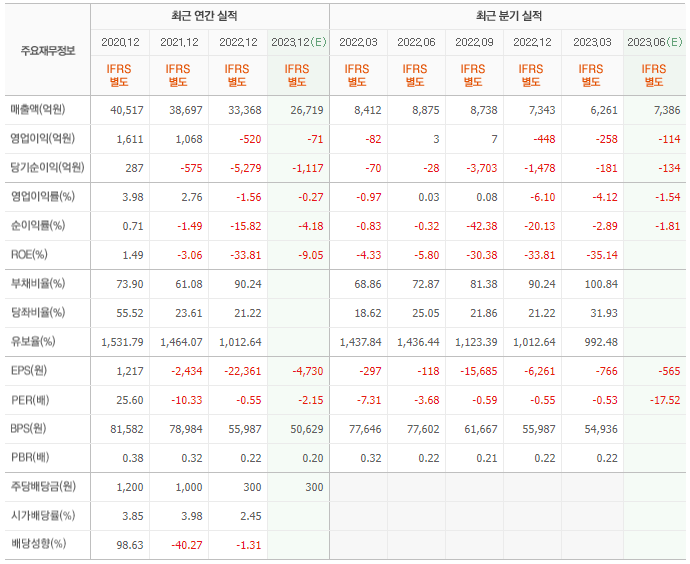 2022년 매출은 3조 3368억, 영업이익은 -520억, 당기순이익은 -5279억입니다. 그리고 영업이익률은 -1.56%입니다.