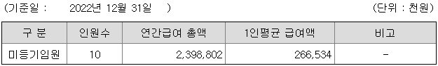 미등기임원의 평균연봉은 2억 6600만원이고 직원수는 10명입니다.