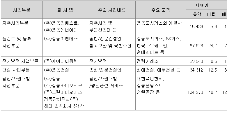 주식회사 경동인베스트와 그 종속회사(이하 연결실체)의 연결부문인 사업부문은 서로 다른 사업과 용역을 제공하는 전략적 사업단위입니다. 각 사업은 서로 다른 공사기술과 서비스용역 등을 요구하고 있기 때문에 별도로 운영되고 있으며, 각 사업부문별 제품 등은 다음과 같습니다.