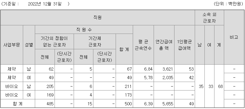 의약품사업 중 바이오의약품의 경우 2022년 12월 19일 합병을 통해 신설된 바이오 사업무문이 담당할 예정이며, 흡수합병을 통해 인수한 오송공장은 관류식 연속배양 방식의 항체의약품 상업생산 시설로 연간 280만리터 이상의 배양액을 생산가능하고, 3000kg 이상의 항체 원료의약품을 만들 수 있는 공장으로 연간 항체 생산능력 면에서 세계 5위에 해당합니다. 상업생산이 가능해진다면 매출에 큰 도움이 될 것으로 예상 됩니다.