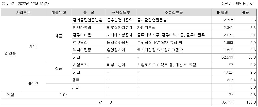 의약품사업 중 합성의약품의 경우 당사 제약사업부문이 담당하고 있으며, 식품의약품안전청으로부터 의약품 제조 및 품질관리기준 적합 판정(KGMP)을 받은 화성공장에서 항생제, 순환기제, 소화기제, 동맥경화용제, 항바이러스제 등 약 140개 품목의 의약품을 생산, 판매하고 있습니다