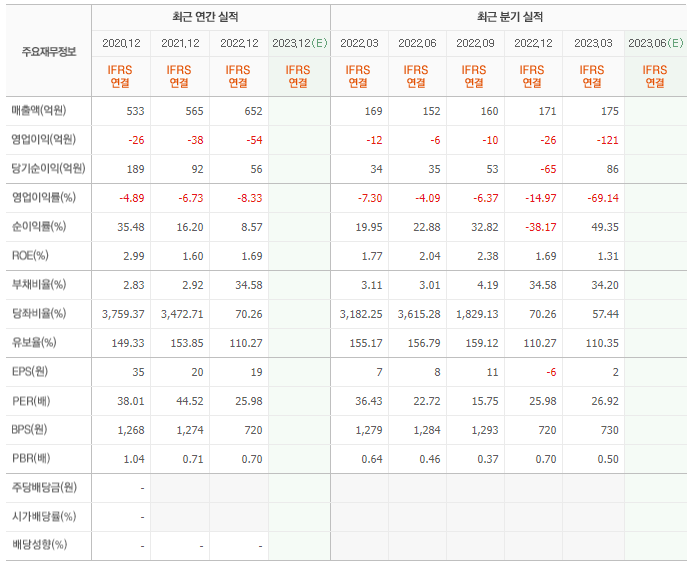 2022년 매출은 652억, 영업이익은 -54억, 당기순이익은 56억입니다. 그리고 영업이익률은 -8.33%입니다.