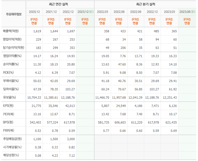 2022년 매출은 1697억, 영업이익은 253억, 당기순이익은 353억입니다. 그리고 영업이익률은 14.93%입니다.