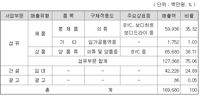 당사는 제조업(도소매 포함), 건설업, 임대업을 영위하고 있으며, 제조업은 메리야스류의 제품을 주로 제조(또는 외주생산한 상품을 매입)하여 판매하고 있으며 건축도급공사와 자체분양공사로 건설업을 영위하고 있으며, 당사 보유부동산을 통하여 임대사업도 영위하고 있으나, 당사의 주업종은 제조업입니다.