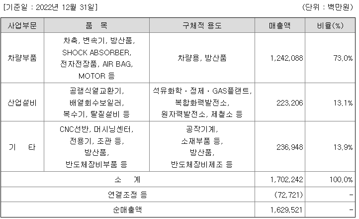 당사 및 주요종속회사는 차량부품, 산업설비 및 기타사업을 영위하고 있으며, 사업부문별 주요 제품 및 서비스 현황은 다음과 같습니다.
