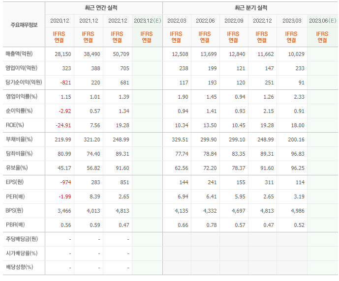 2022년 매출은 5조 709억, 영업이익은 705억, 당기순이익은 681억입니다. 그리고 영업이익률은 1.39%입니다.