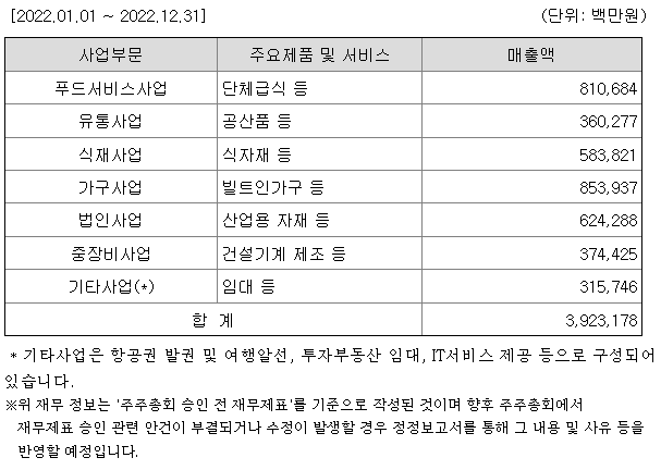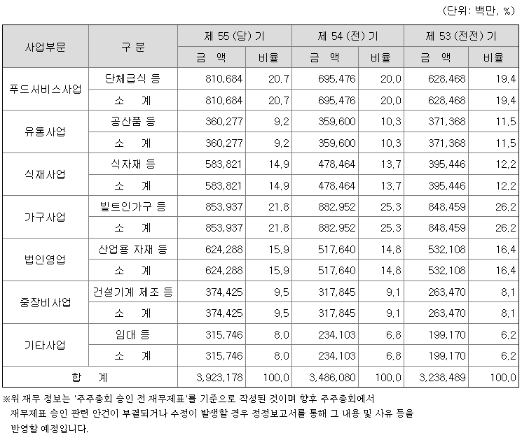 연결회사의 주요 매출은 매출형태 및 판매경로에 따라 구분할 수 있습니다. 매출형태로는 크게 푸드서비스사업, 식재사업, 유통사업, 법인영업, 중장비사업, 가구사업, 기타사업으로 구분할 수 있고, 각 사업부분의 거래선 접근 방식에 따라 푸드서비스사업은 단체급식, 식재사업/유통사업/법인영업/중장비사업은 직거래 그리고 기타사업부문은 소프트웨어 개발 및 공급업, 임대, 여행사업등으로 구분할 수 있습니다.