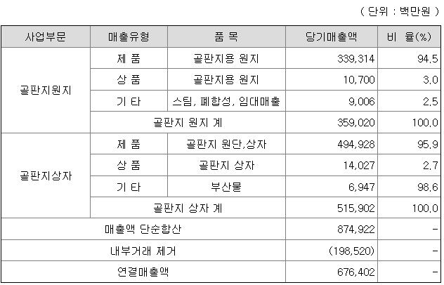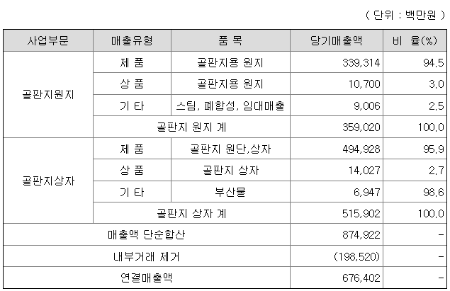 당사는 골판지 원지와 골판지 상자 부문으로 사업영역이 구분되어 있으며, 사업부문별 매출액은 아래와 같습니다.