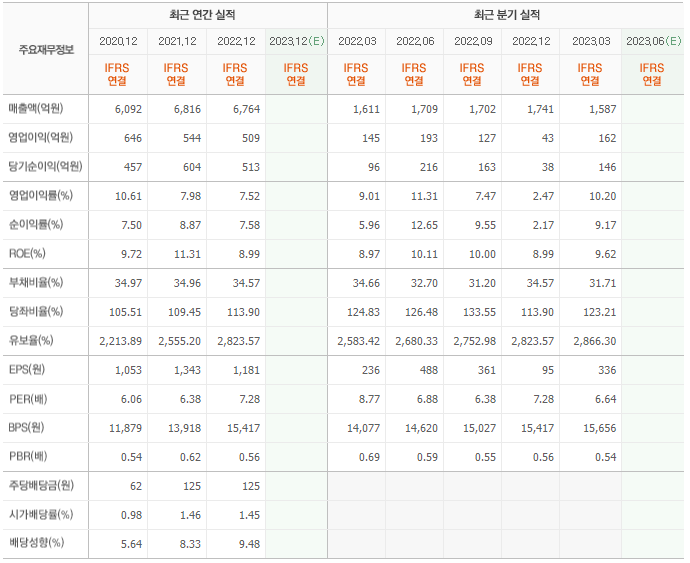 2022년 매출은 6764억, 영업이익은 509억, 당기순이익은 513억입니다. 그리고 영업이익률은 7.52%입니다.