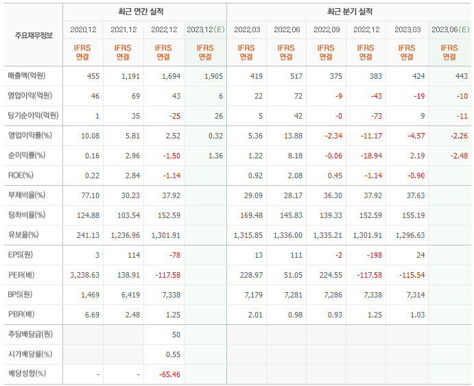 2022년 매출은 1694억, 영업이익은 43억, 당기순이익은 -25억입니다. 그리고 영업이익률은 2.52%입니다.