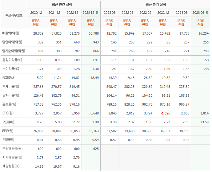 2022년 매출은 6조 1270억, 영업이익은 668억, 당기순이익은 787억입니다. 그리고 영업이익률은 1.09%입니다.